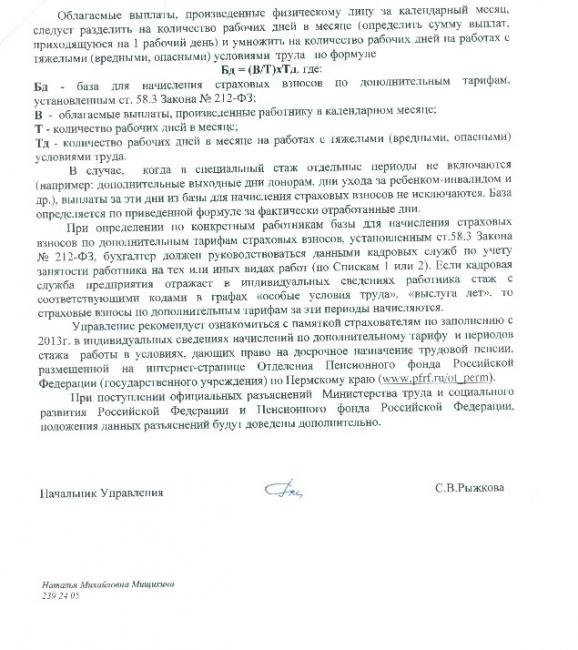 Согласен с Вами, но в Митруде похоже считают по другому, иначе бы в письмах была формулировка "пропорционально календарным дням засчитываемым в стаж работы дающего право на досрочное назначение пенсии...", а не "пропорционально фактически отработанному времени".Сообщение от IgorAV Посмотреть сообщениеПо-моему если льготный стаж исчисляется в каландарных днях, то и расчет доп.тарифа должен производиться в пропорционально календарным дням.