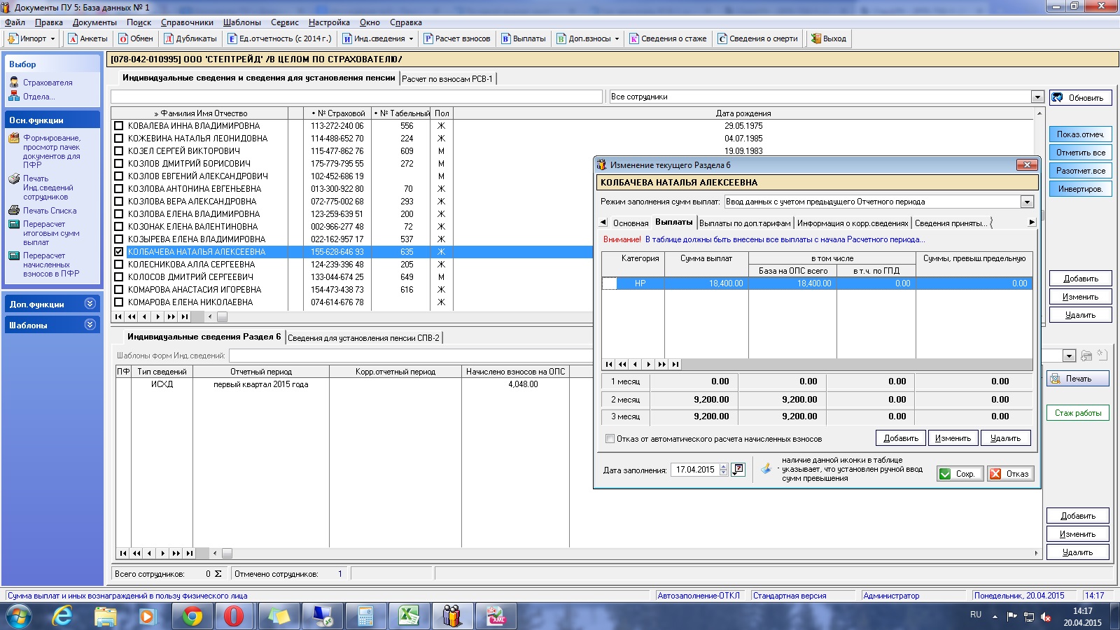 ОПС 4048 по этому сотруднику! Вот странно, программа начисления зарплаты видит 18 400, а 4048 взносы получается нет? Я плохо в этой программе еще разбираюсь, никак не соображу!
