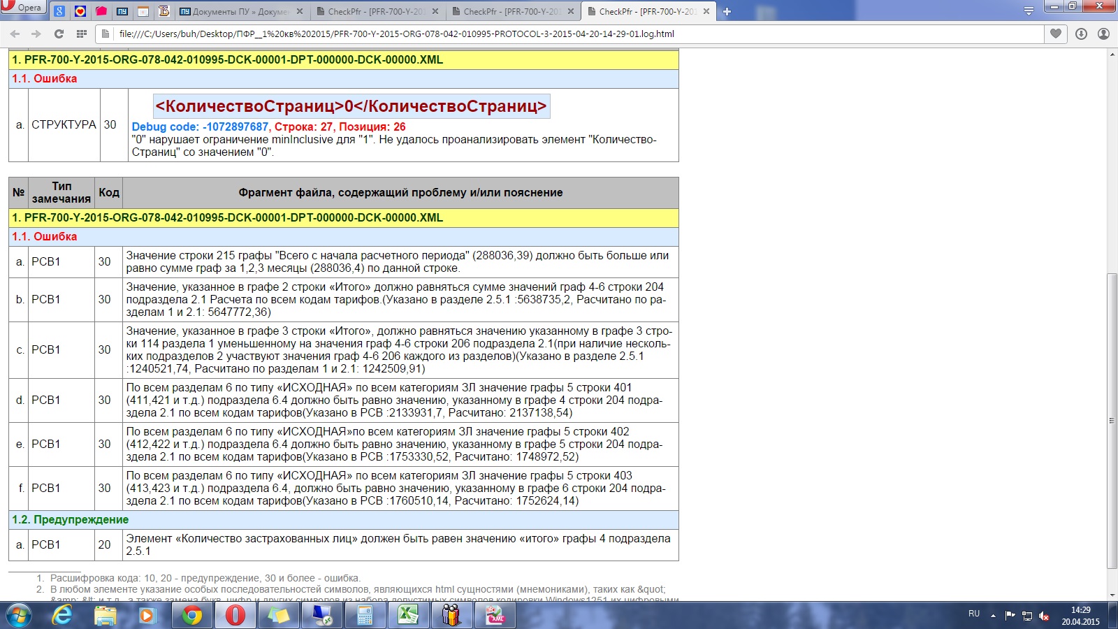 Ольга, а с чего вы решили, что в отчет не попал именно этот сотрудник? (который на "фотке").Сообщение от ольга валанчик Посмотреть сообщениеДобрый день! Помогите мне, пожалуйста, решить проблему! Я сформировала отчет рсв-1 (программа ПУ5 с последним обновлением от апреля 2015 г), проверила его в программе CheckPFR (версия от 02.04.15), программа выдала ошибки " Зна*че*ни*е, у*ка*за*нное в гра*фе 2 стро*ки «*И*то*го» до*лжно ра*вня*ть*ся су*мме зна*че*ний граф 4-6 стро*ки 204 по*дра*зде*ла 2.1 Ра*сче*та по всем ко*дам та*ри*фо*в".