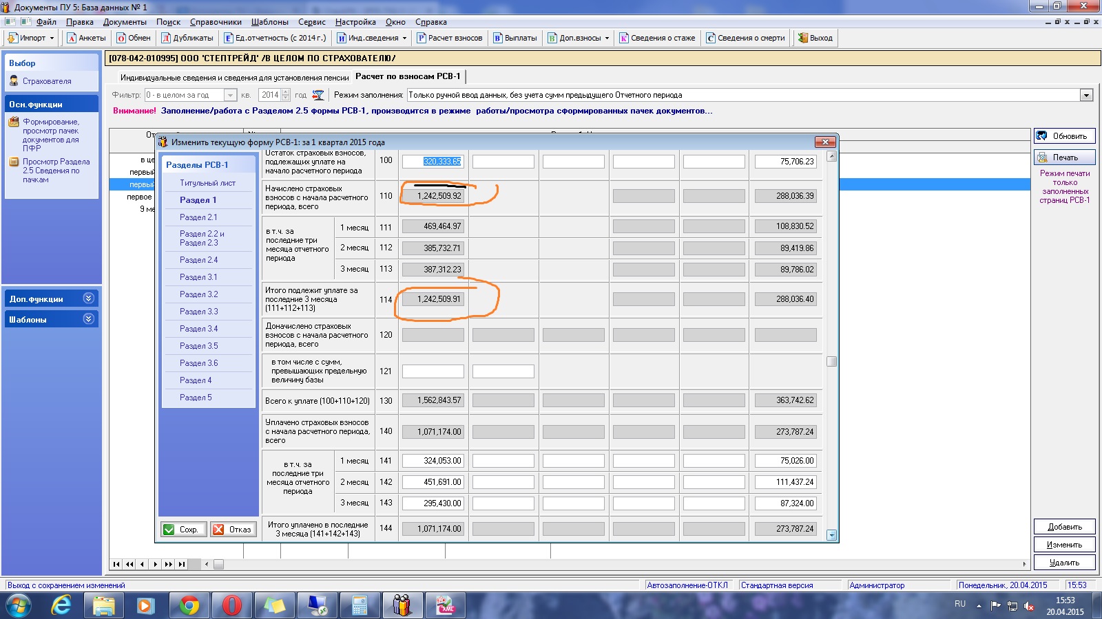 Я начала искать, где я могла допустить ошибку, и нашла! У меня почему то в отчет не попадает 1 сотрудник! А почему он не попадает, я понять не могу! Я начала с малого: удалила сотрудника и внесла снова его данные, потом это проделала с отчетом РСВ-1, в надежде, что это может глюк от процесса обновления программы. Не помогло.